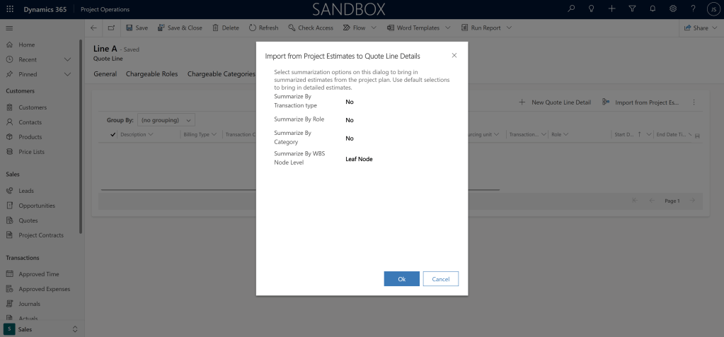 After linking my project to the Quote Line, I need to Import the tasks from my Project by clicking on Import from Project Estimate under the tab Quote Line Details (note if you did not link a project to this Quote nothing will show here after you click the button. Also, if you did not link a SALES Price List the numbers will be zero):