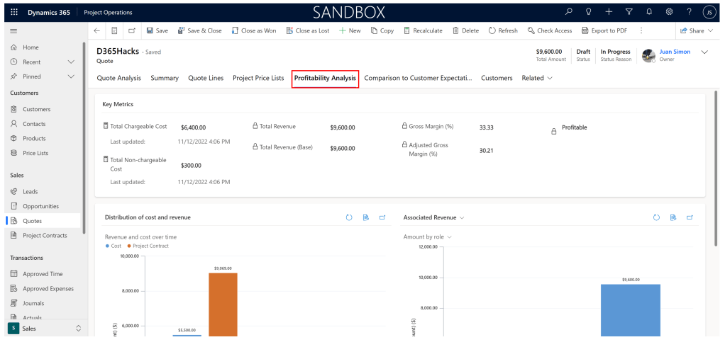 The next step is to naturally either close this quote as Won (creating a Contract with the same information) or close as Lost where it archives this quote. Important to note that the project, in this case, created to estimate this quote line, needs to be manually ‘closed’ by deactivating the record. Project Operations does not make that assumption for you (this can be easily automated with Power Automate).