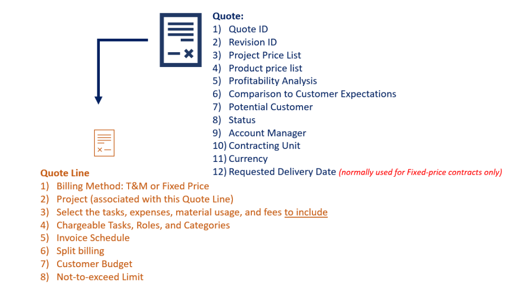 It is very important to understand the relationship of Quote and Quote Line. Quote is the head record, and as such it holds specific information that affects Quote Lines. The image bwlow illustrates what information both are capturing it: