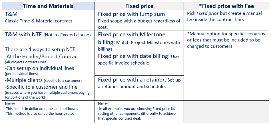 They are called Billing Methods, and by being a Task-Based Billing system, that means that for every task line inside your WBS/Tasks tab you can have a separate contract associated with it, with specific rules. Here are some of the options: