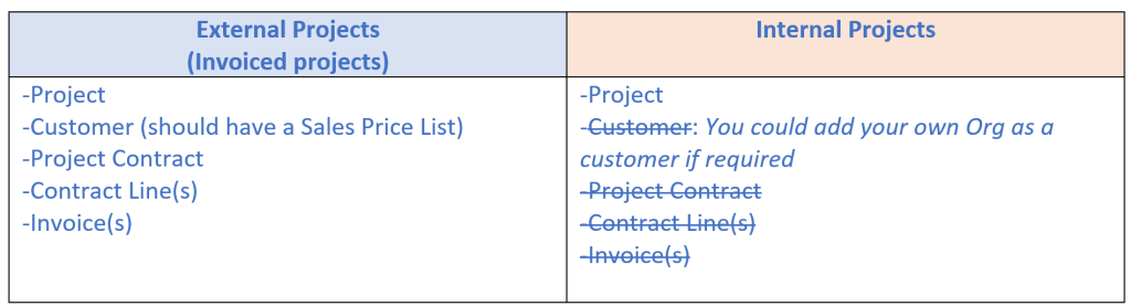 Internal projects are leaner (as far as setting up goes), you only need to create a project and assign tasks and execute it! As long as the Contracting Unit/Organizational Unit contains a COST PRICE LIST you will be able to track all time/expenses against the project.