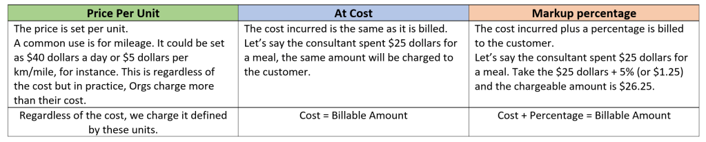 For Category Prices (aka: Expense categories), you set how expenses are charged against projects by utilizing three methods, named: Price per unit, At cost, and Markup percentage:
