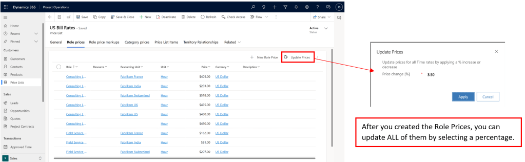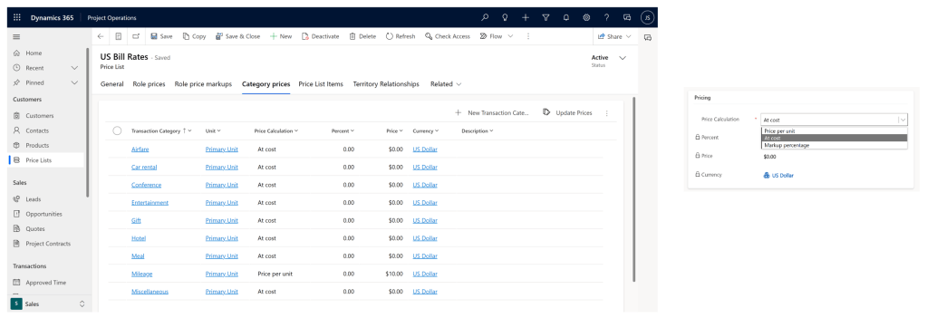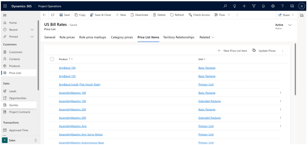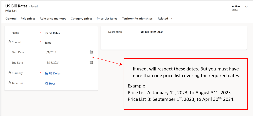 Now let’s discuss Sales Price Lists in more detail. If you stop to consider, sales price lists are indispensable, since some organizations that use Dynamics 365 Project Operations may not use the cost function, sales normally is a must. The expection would be if you only use the tool for internal projects that are not billable and in that case you only wish to track your costs!